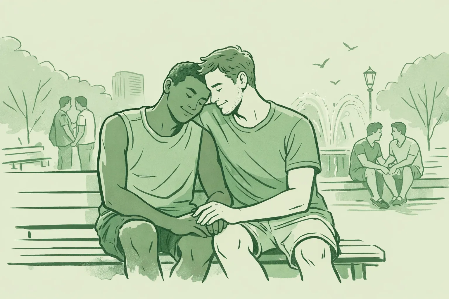 Gay men offering emotional support and comfort, demonstrating tenderness in MM relationships