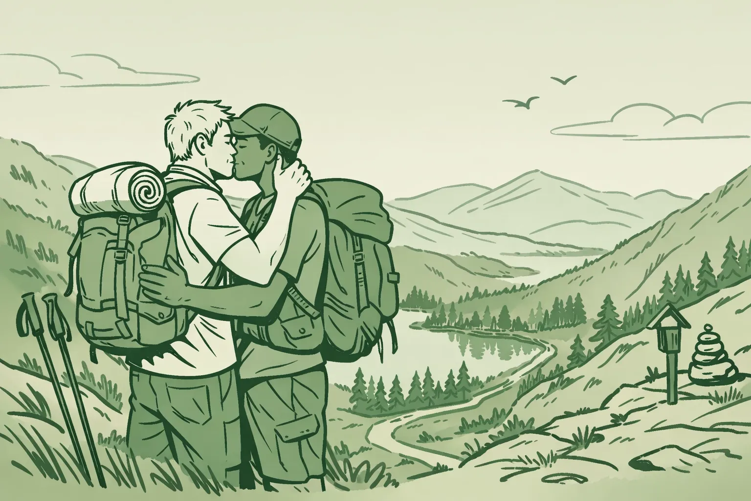Two male hikers walking together on mountain trail - MM romance and adventure