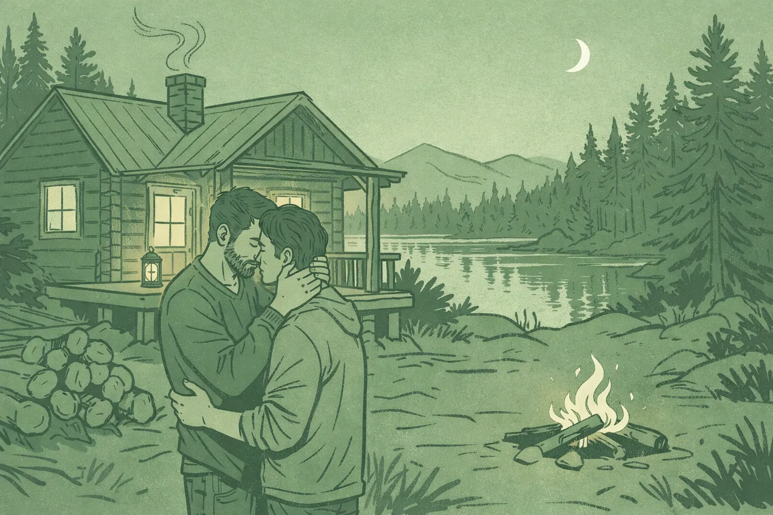 Two men embrace outside isolated cabin at dusk as danger looms in dark forest - MM thriller romance