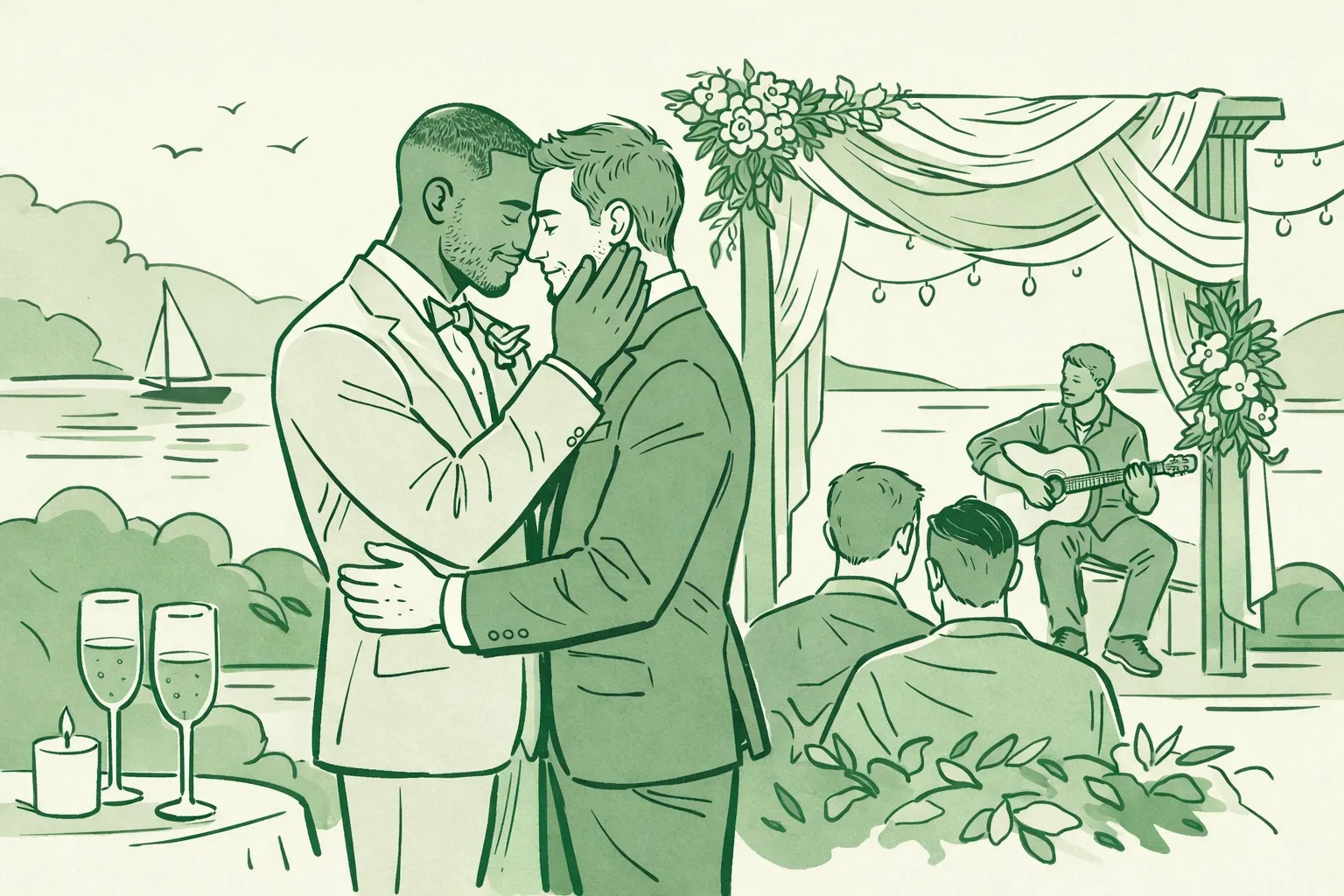 - Two grooms, no "bride" role: Eliminate gendered customs like the bouquet toss or "giving away" rituals