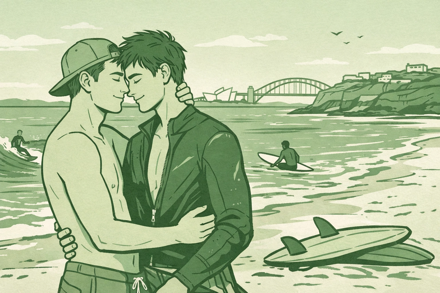 The Sydney setting amplifies their journey. Beach bonfires. Sunrise surf sessions. Harbour views. Coastal walks. The city's gay-friendly culture provides context but doesn't simplify their specific situation.