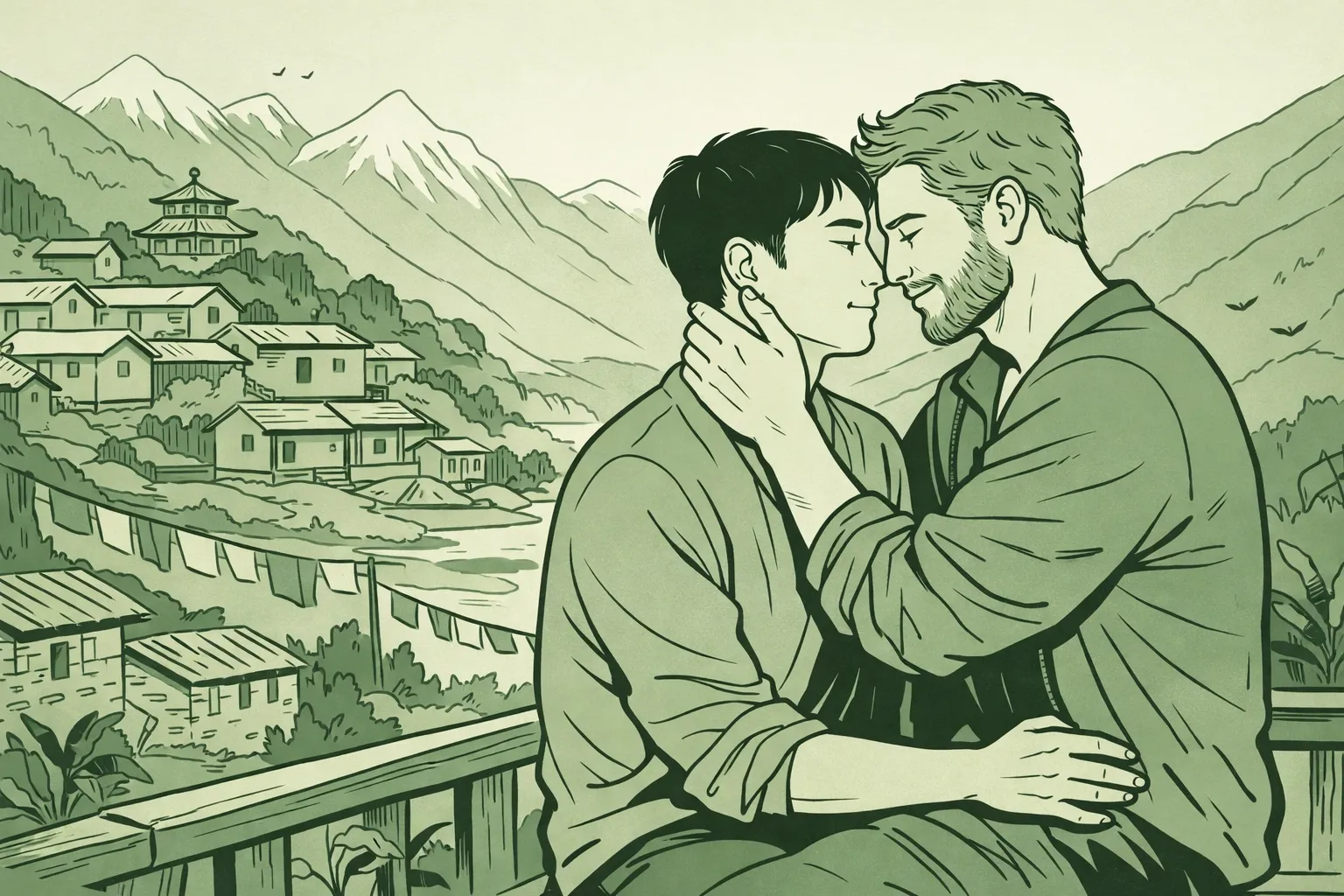 A lingering glance while sorting cocoons. Fingers brushing during the evening meal. The particular way Kenji corrects Takeshi's hand position while reeling silk, standing closer than strictly necessary. These small gestures carry the weight of everything they cannot say aloud.