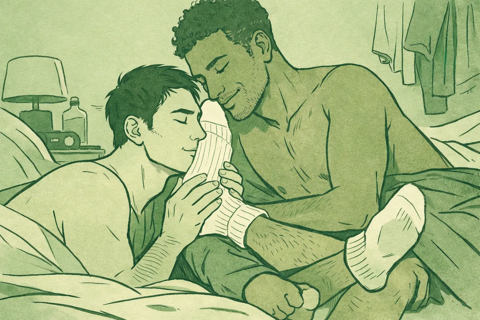 He buries his face in the fabric. Cotton, worn soft. The scent hits immediately: salt, musk, the particular chemistry that belongs only to him. This isn't about the sock. It's never about the sock. It's about the man who wore it. The presence that lingers when the body has left the room.